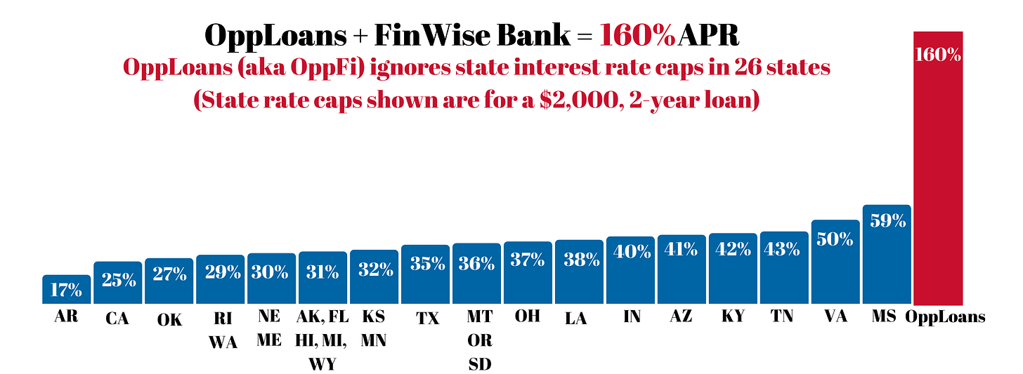 A new graphic provided by the National Consumer Law Center (NCLC) demonstrates how online lender OppLoans violates state interest rate caps and charges 160% interest rates by using a “rent-a-bank” scheme. Such schemes are allowable under a Trump-era rule authorized by the Office of the Comptroller of the Treasury.